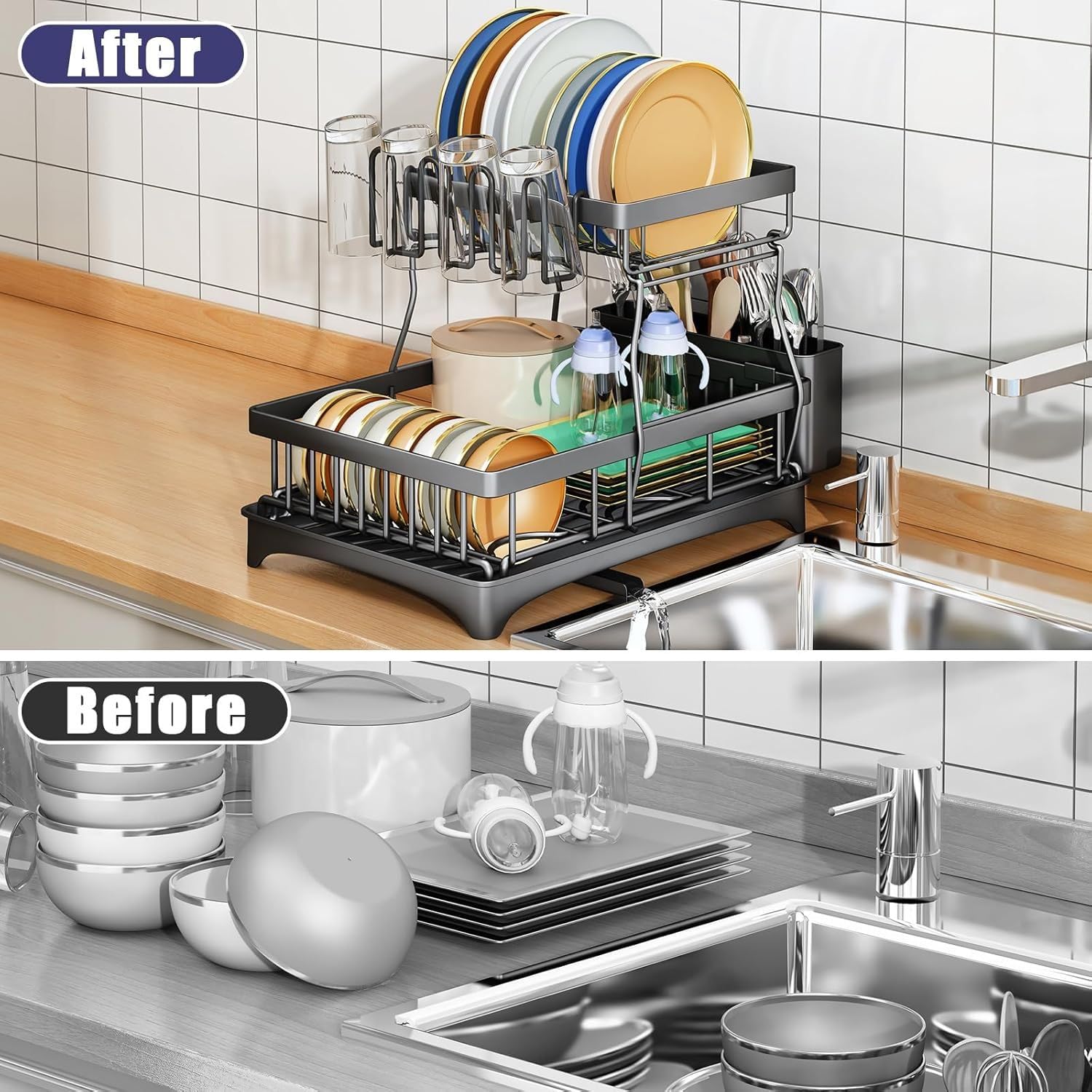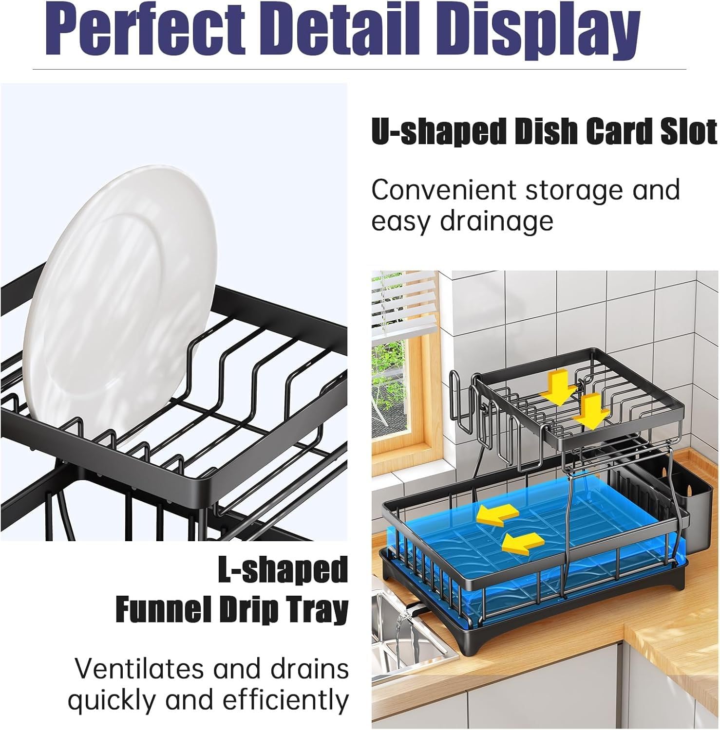 - Detachable 2-Tier Dish Rack – Designed with a removable two-tier structure, this dish drying rack includes a utensil holder and cup rack, providing ample space for plates, bowls, mugs, pots, pans, and more.